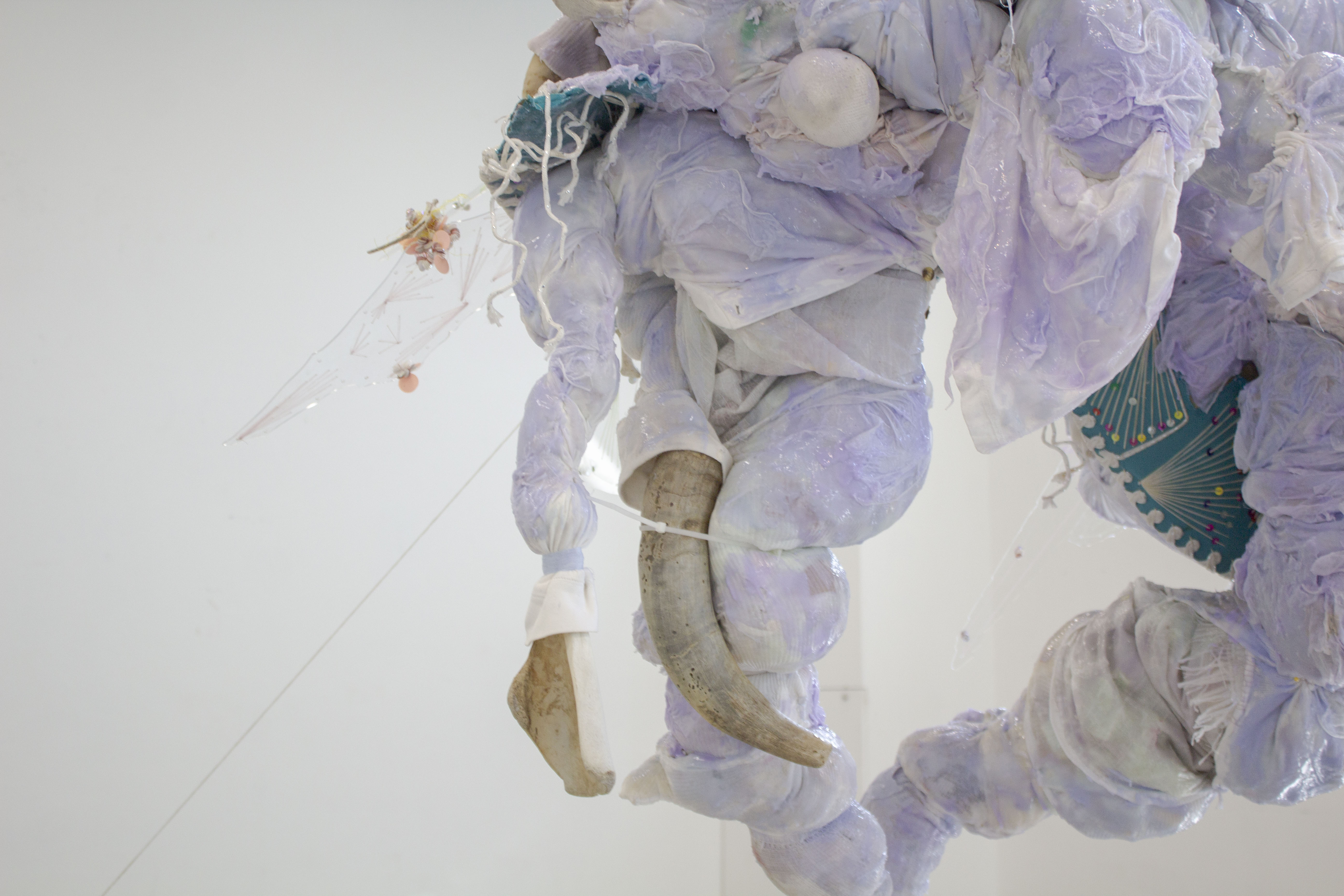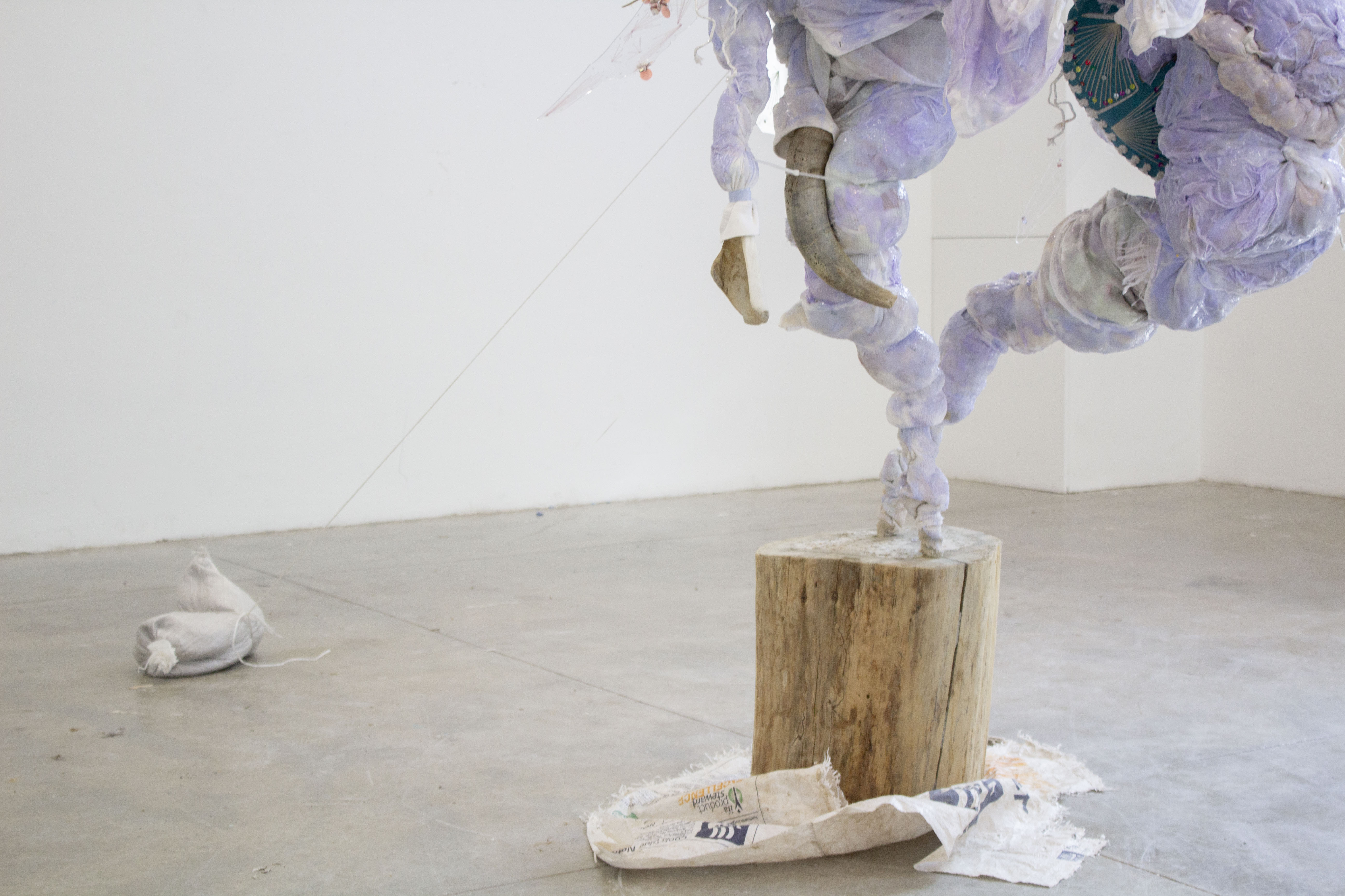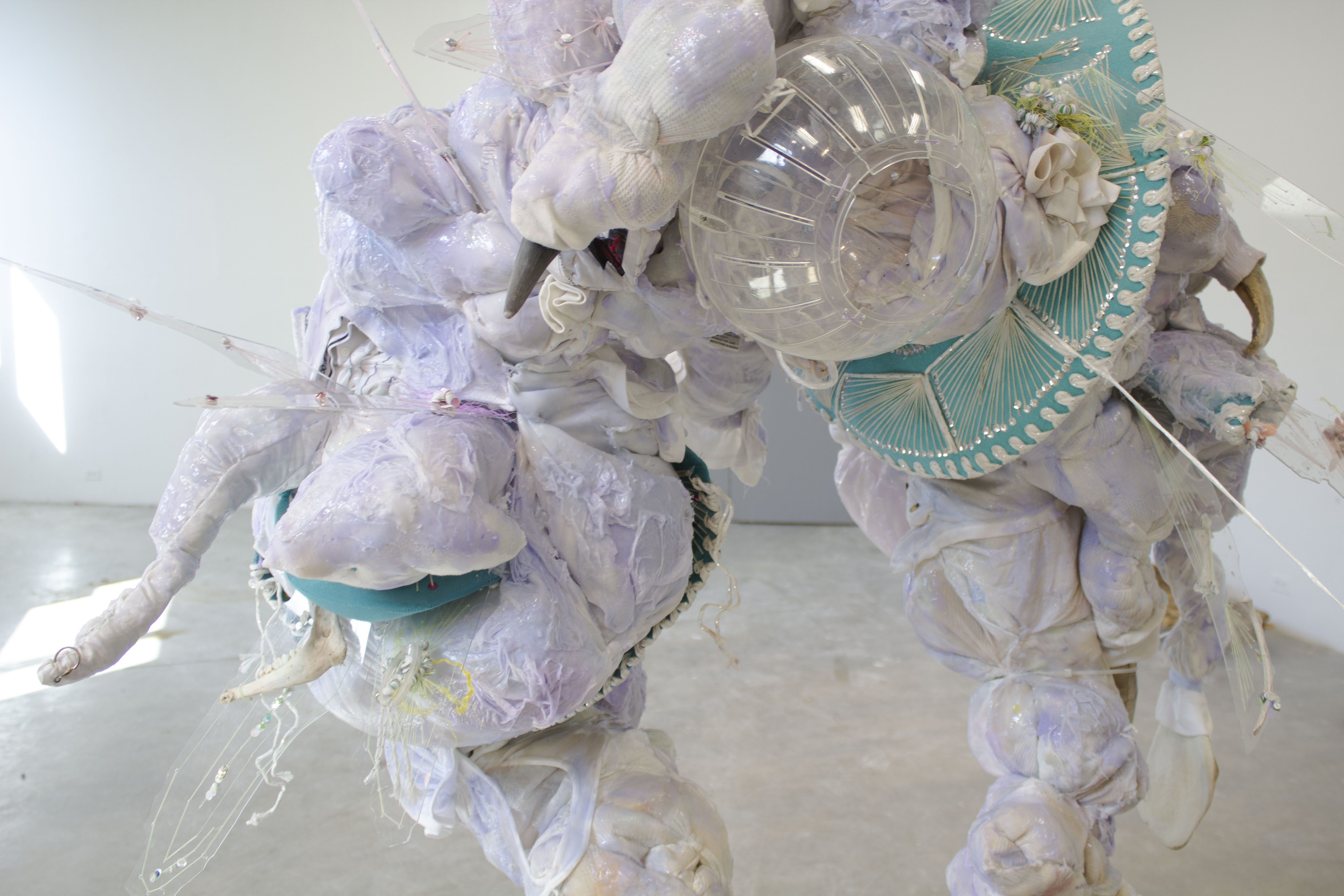 My clothes, clay from the James River, silicone, sand bags, fertilizer bag from my famaly’s pecan farm, mariachi sombrero, cement, hamster wheel, plexi, dog hair, sequins, socks, twine, bull horns, zip tie.