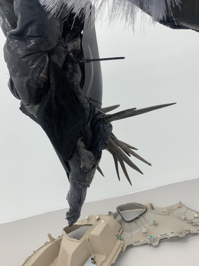 Black sweatpants and 5xl t-shirt, half a bovine horn, rabbit pelt, black plastic twine, blue corn from Maria’s garden, small used broom and large car parts found at Flatbush on Tuesday when I had to move my truck for street clean up, black nail polish, fallen truck parts in Mcnutt Road, detritus from the Rio Grande, Gemsbok Horn tips, steel rod, sand from the Chihuahuan Desert, dragon skin silicone, cassette tape, zip ties