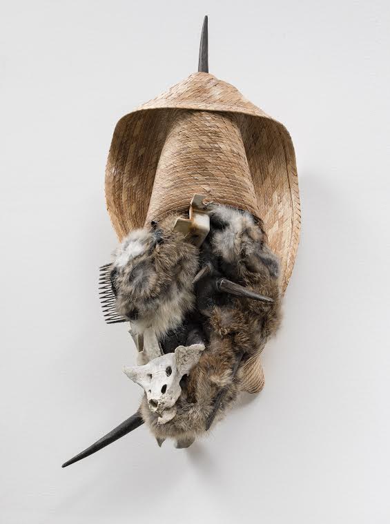 Straw hat sombrero, lil straw hat sombrero, five Gemsbok horn tips, black sweatpants, rabbit fur pelt, found bun clip, bone-white detritus of the Rio Grande River, zip tie, horns found on a Texas rest area, pigmented dragon skin silicone.
